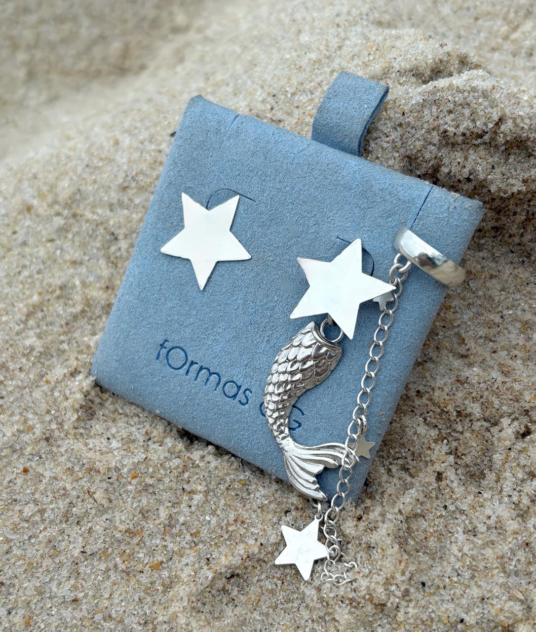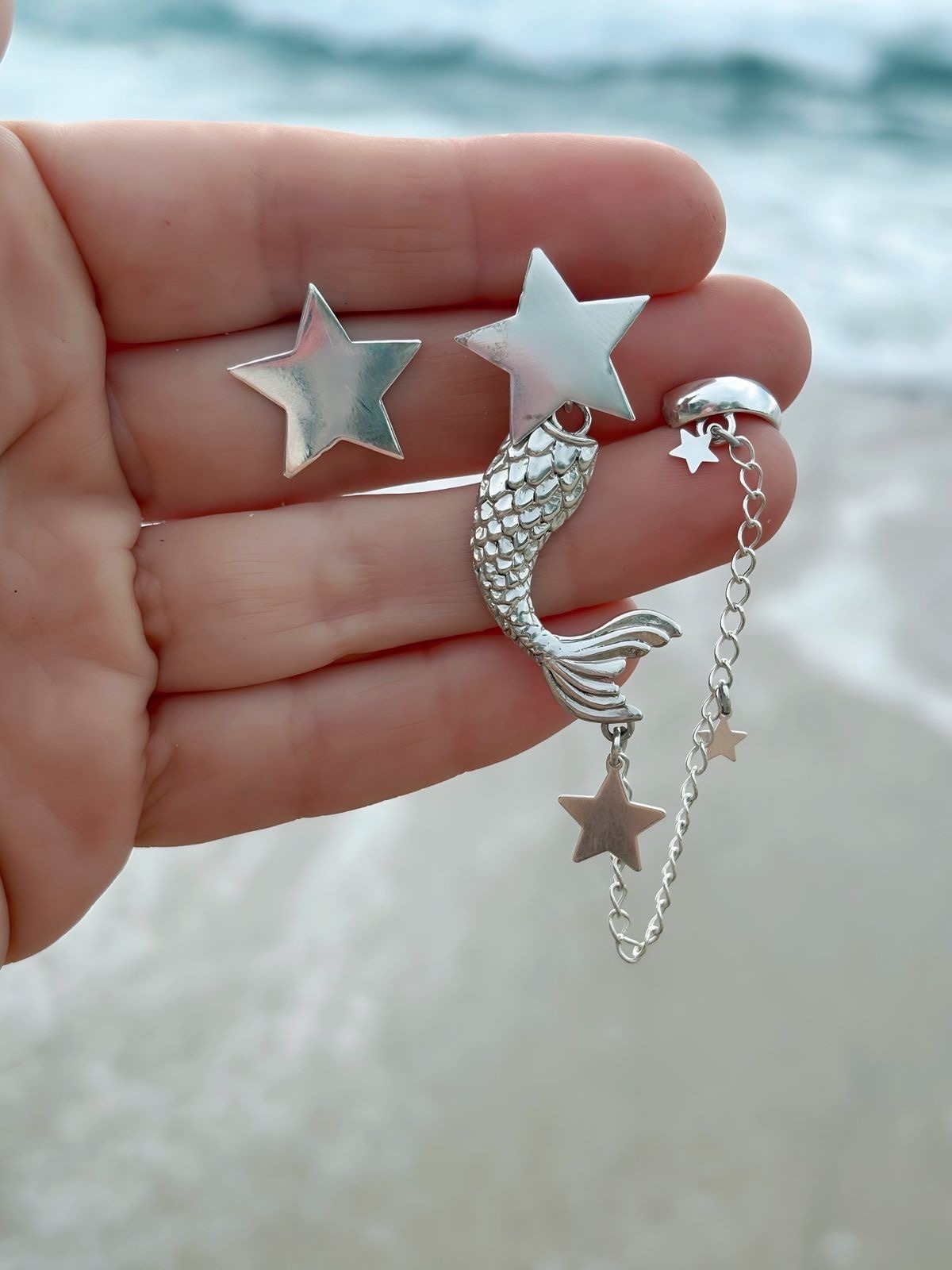 Sirena tiene tornillo tradicional y Ear cuff (no necesita perforación) a presión con cadena. La estrella solitaria tornillo tradicional.